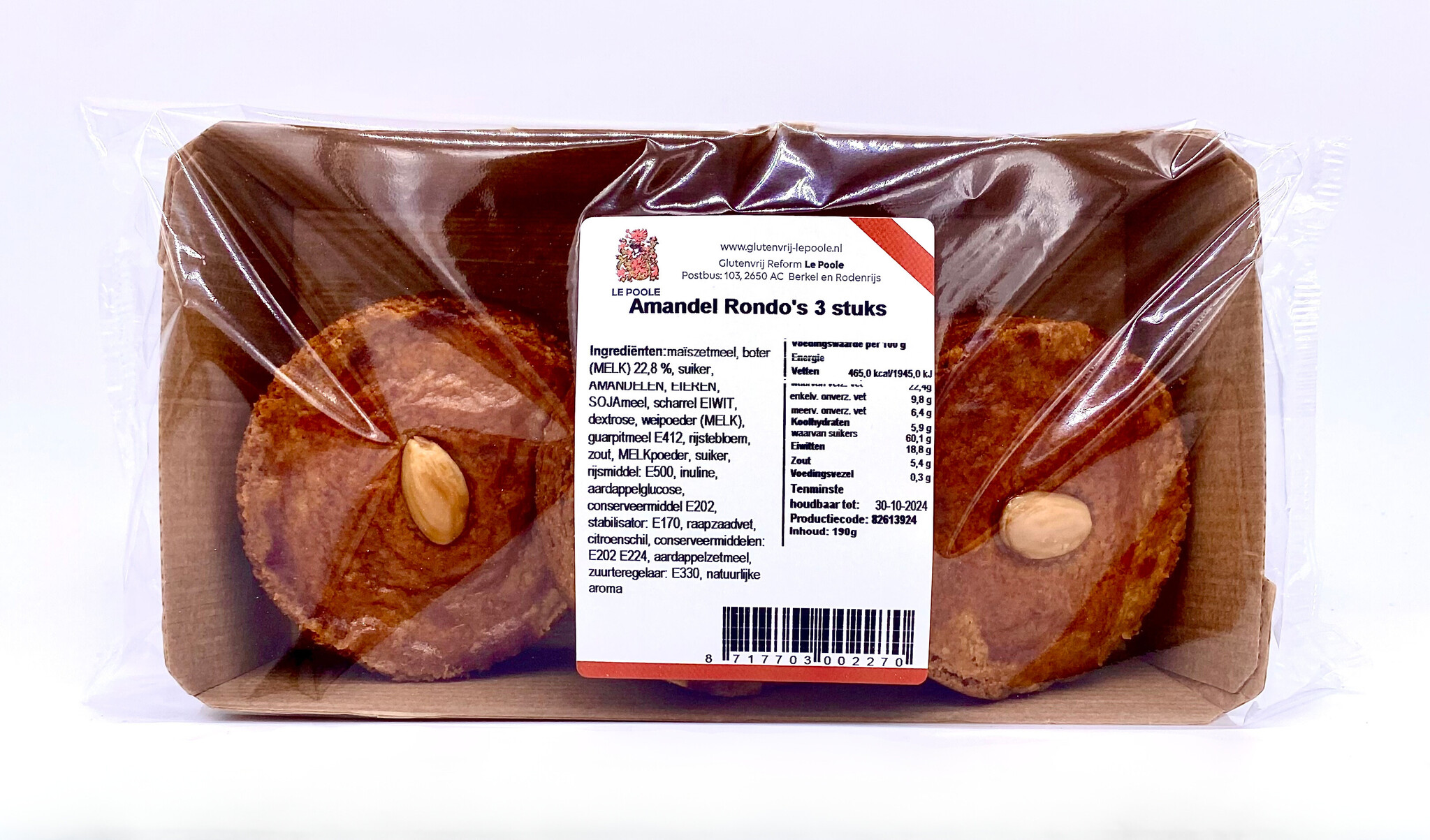 Ingrediënten: Maiszetmeel, boter (MELK) 22,8%, suiker, AMANDELEN, EIEREN, SOJAmeel, scharrel EIwit, dextrose, weipoeder (MELK), guarpitmeel E412, rijstebloem, zout, MELKpoeder, suiker, rijsmiddel: E500, inuline, aardappelglucose, conserveermiddel E202, stabilisator: E170, raapzaadvet, citroenschil, conserveermiddelen: E202, E224, aardappelzetmeel, zuurteregelaar: E330, natuurlijk aroma.