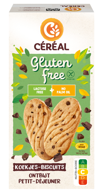 Gluten- en lactosevrije ontbijtkoekjes met stukjes chocolade van Céréal. Bevat 4x4 koekjes, makkelijk mee te nemen als tussendoortje! Lees meer