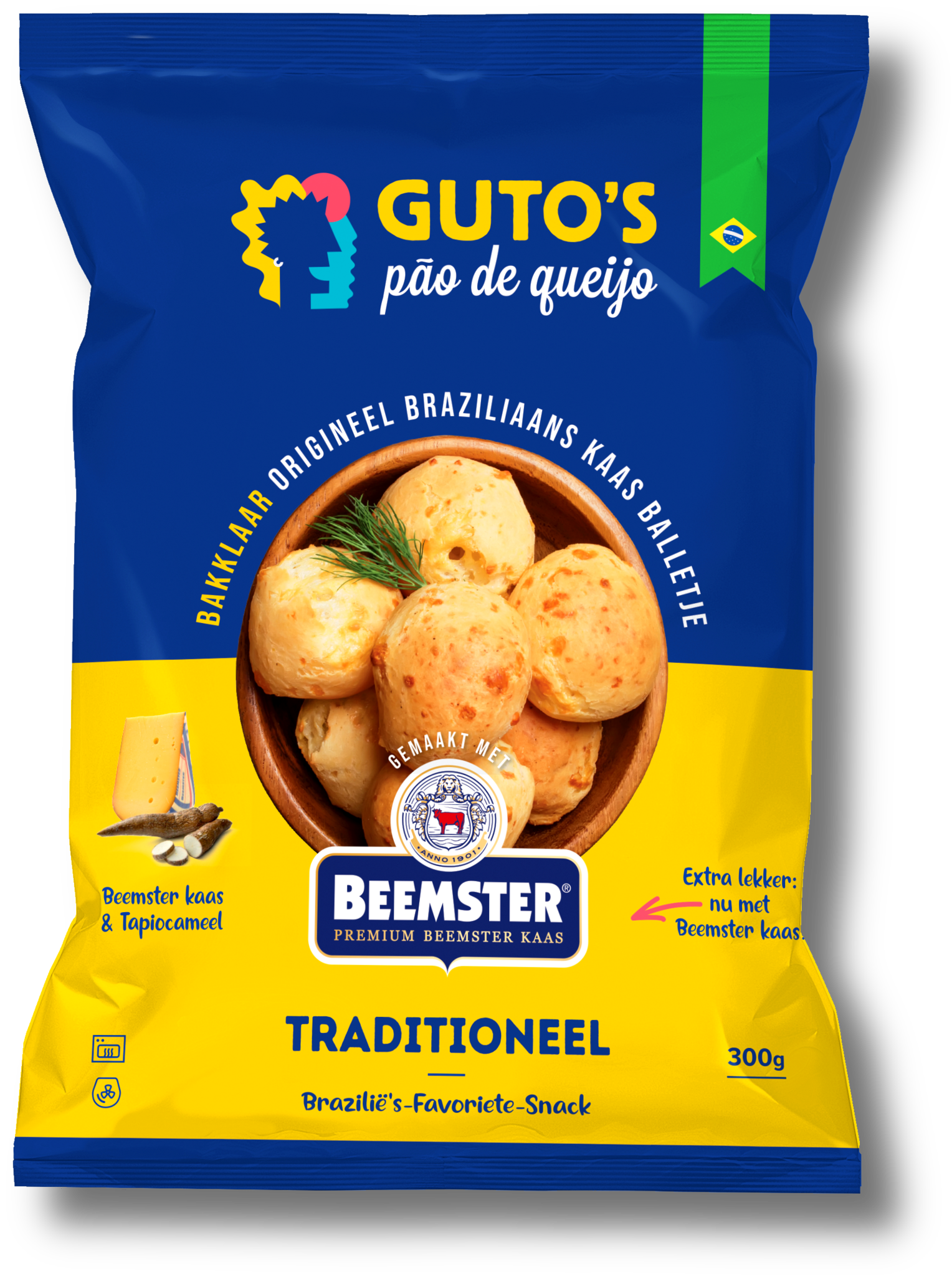 Ingrediënten: Tapiocabloem, kaas 22,2% (gepasteuriseerde koemelk, zout, zuursel, stremsel), melkpoeder, eipoeder, water, zonnebloemolie.
