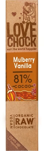Lovechock chocolade met moerbei en vanille. Deze heerlijke biologische chocolade is helemaal glutenvrij, veganistisch en milieuvriendelijk! Lees meer