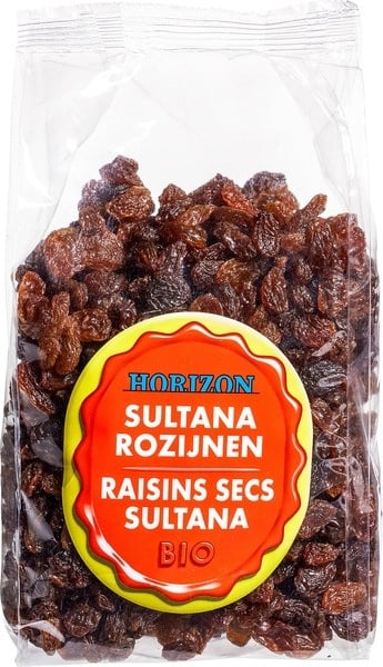 Horizon - Rozijnen Biologisch 500g. Biologische sultana rozijnen om lekker en gezond te snacken of te verwerken in diverse glutenvrije bakwerken, zoals cake, taart, brood of pannenkoeken. Ook lekker door de havermout of yoghurt. Lees meer