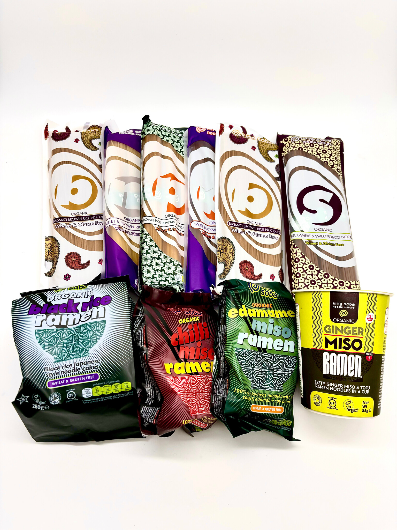 Een tas met 10 Noodle producten van King Soba, de houdbaarheid datum van de producten is 6-2023. Producten zijn prima van kwaliteit en zelfs nog maanden goed houdbaar.